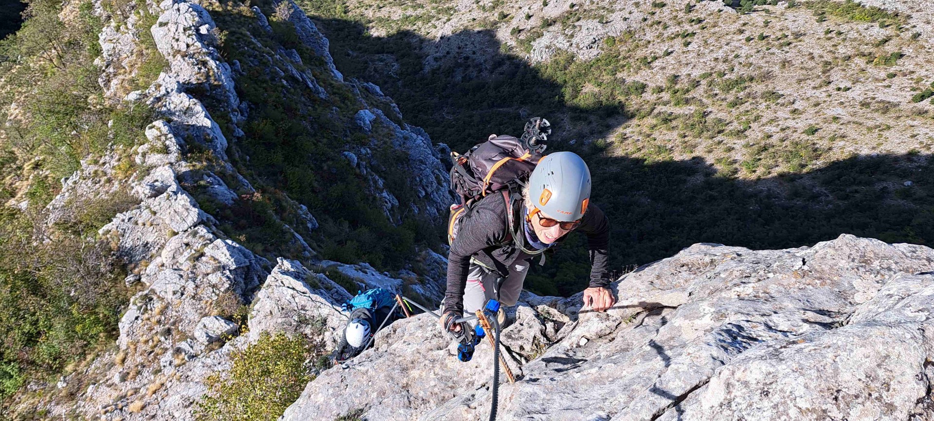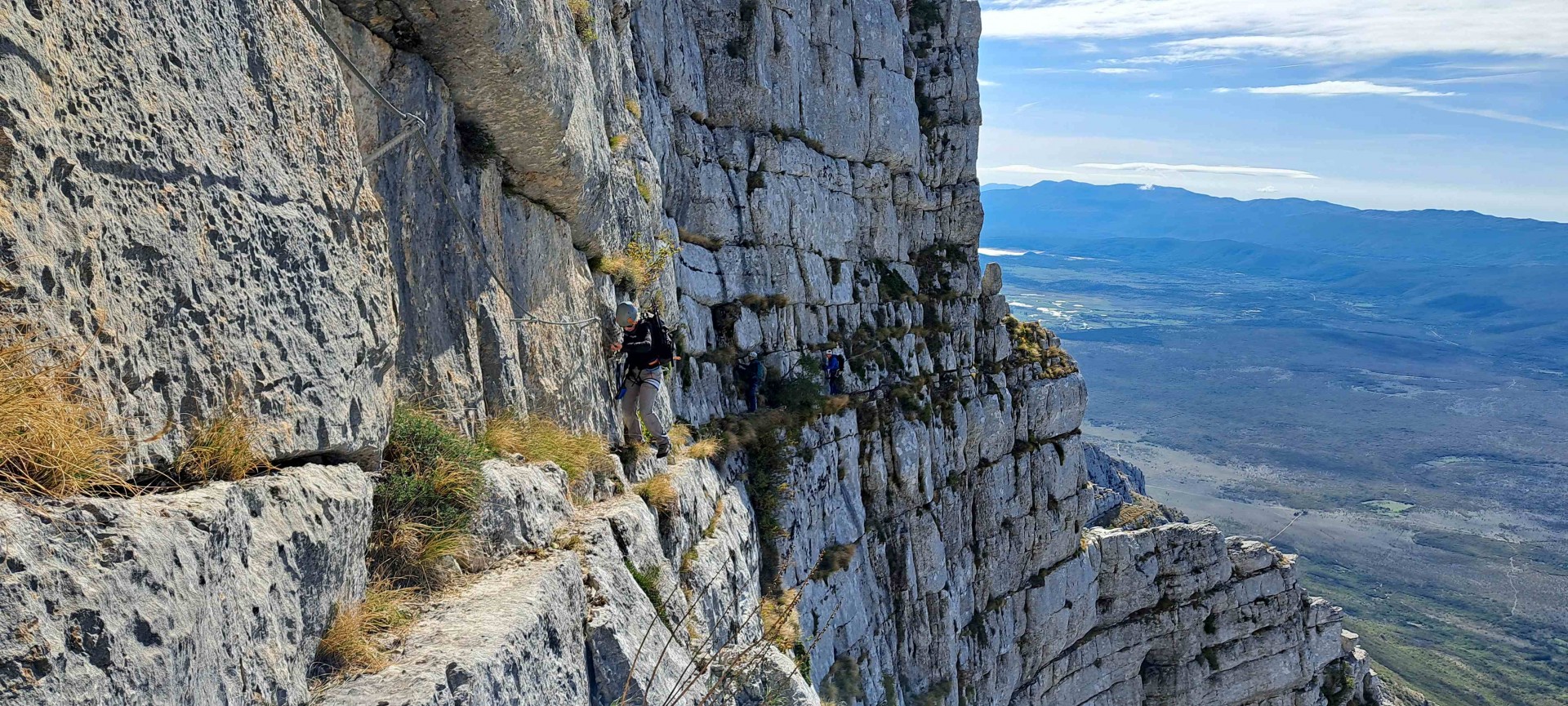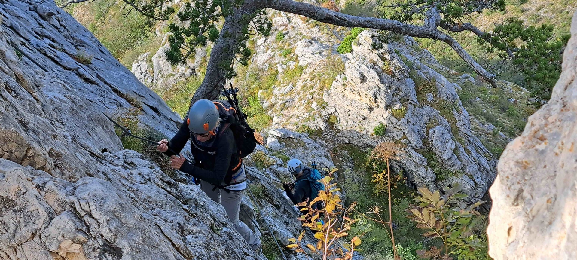 Zgodaj zjutraj ob sončnem vzhodu že iščemo pravo cesto za izhodišče do ferate. Že do vstopa imamo kar lep sprehod, 3,5km po cesti, če si sploh zasluži to ime, nato še nekaj časa po gozdu, da pridemo do mogočne stene, ki se dviga nad nami. Z vsem spoštovanjem do stene pričnemo s plezanjem. Jaz grem že drugič, pot mi je poznana in res uživam. Opazujem babice Jano, Vido in Bredo kako jim gre in res so od sile. Kar vriskajo, tako so zadovoljne. Gremo čez prvi stolp, čez drugega...kar 9 jih je, težavnost se stopnjuje. Do bivaka imaš še nekaj izhodov, če spoznaš, da ti je ferata pretežka. V bivaku se ustavimo, pomalicamo in se malo nadihamo. Še vedno imamo lep dan, zato nadaljujemo. Od tam naprej ni več izhodov, treba je it do vrha. Takoj nad bivakom se pričnejo težji deli ferate in ponekod se je treba kar potruditi tudi z močnimi rokami in pravo tehniko. Ponekod je jeklenica precej oddaljena od dobrih stopov in jo imaš res samo za varovanje, drugače pa lepo plezaš. Še višje pridemo na sonce in lažji del, kjer prečiš steno po policah. Samo en velik užitek je in babice že začnejo vriskat. No, polic je kmalu konec, čaka nas že zadnji težji del in smo na vrhu stene. Normiran čas je 5 ur, me smo bile čez ferato v manj kot petih urah. Haha, še smo v dobri formi. Do vrha Sinjala nismo šli, ker se je preveč pooblačilo, nas je pa čakal še precej dolg zahteven spust.