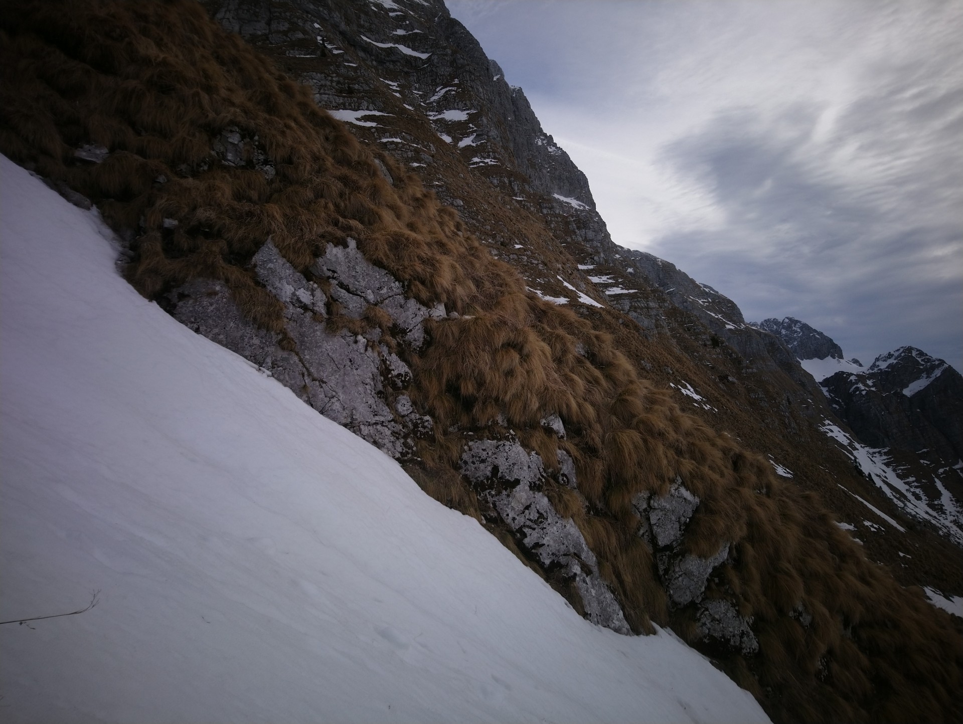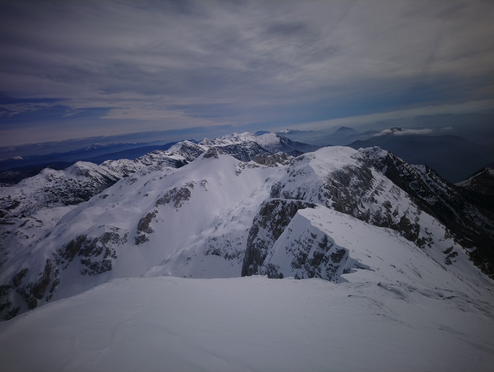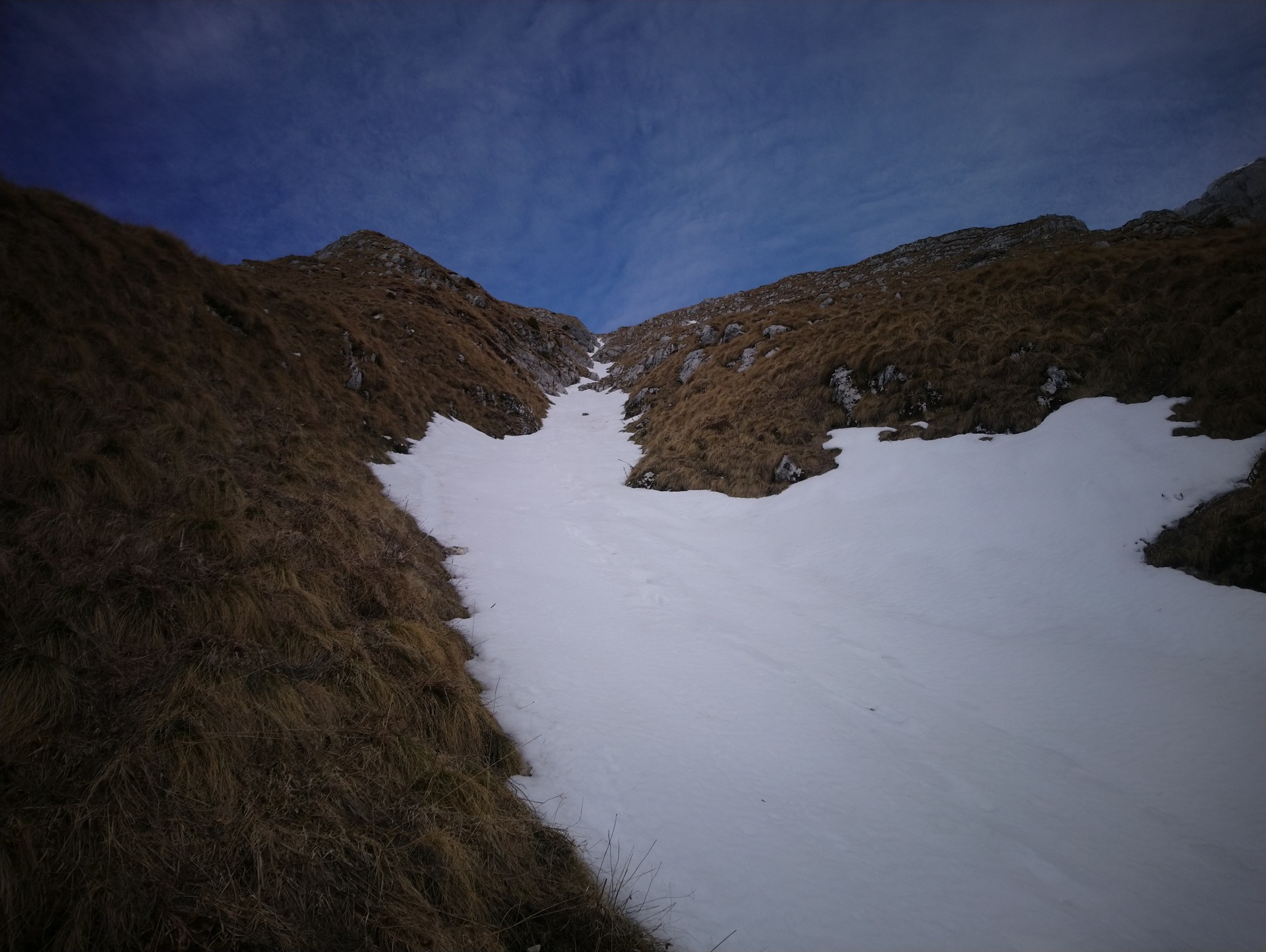 Če prepozno vstaneš, ti še vedno ostane Krnsko pogorje nad hišo. Da si turo malo popestrim se odpravim na Krn 2244m po prav luštni grapi direktno na vrh.
