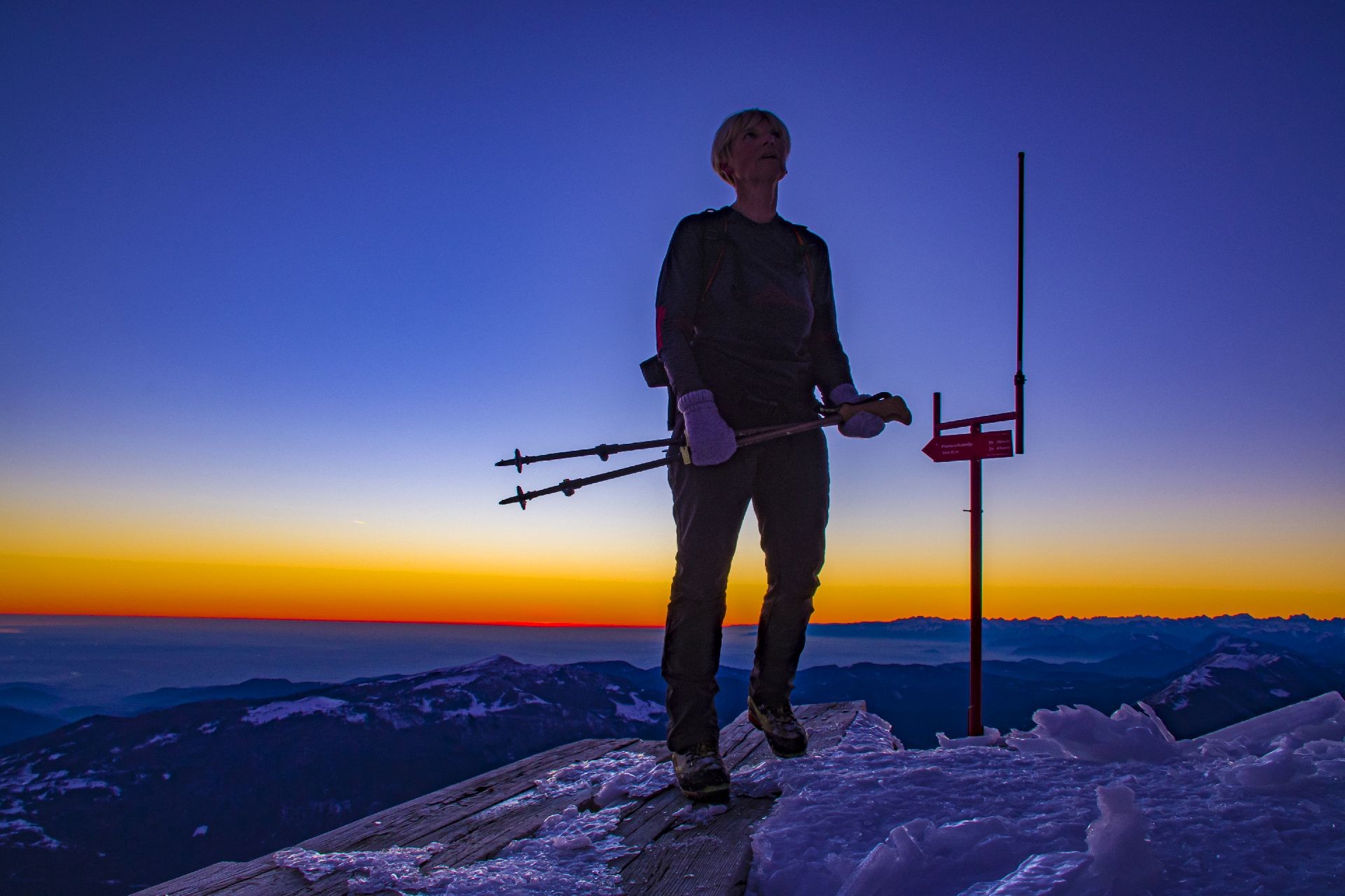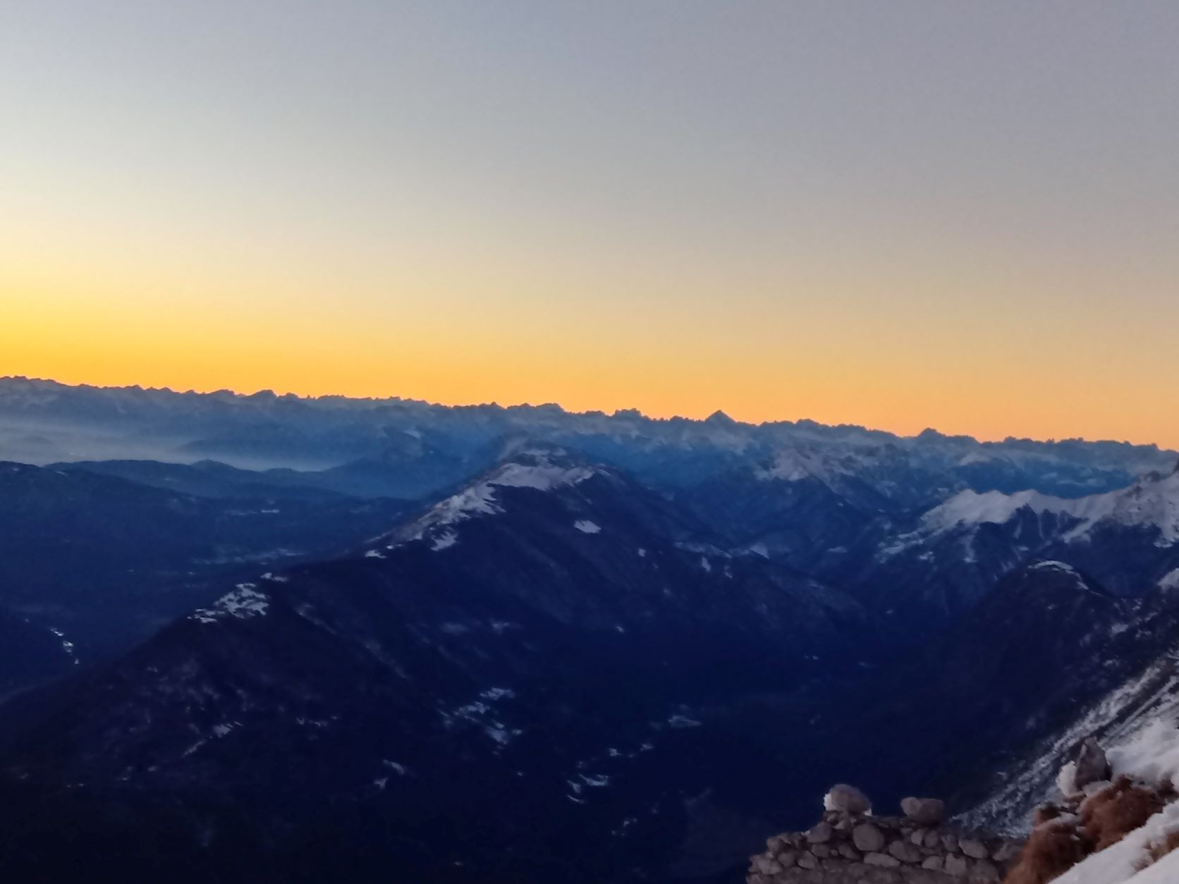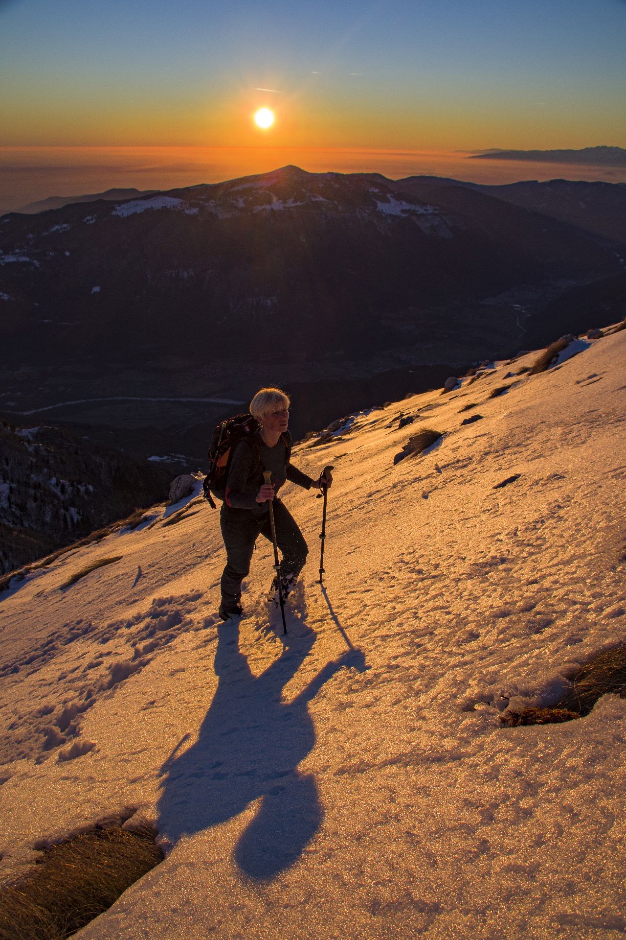 Vsaka noč je bila bolj svetla in padla je odločitev, grem na Krn ob sončnem zahodu in ob svetli polni luni nazaj. Skupaj z reševalcem in fotografom Miljkotom, ki je imel enake plane se zaženeva v precej sončen Krn. Vročina ni popustila do zadnje tretjine, čeprav je šele januar. Ko sva bila skoraj pri koči se je začelo na nebu barvati od zahajajočega sonca. Pohitela sva na vrh in uživala v nebeških barvah.