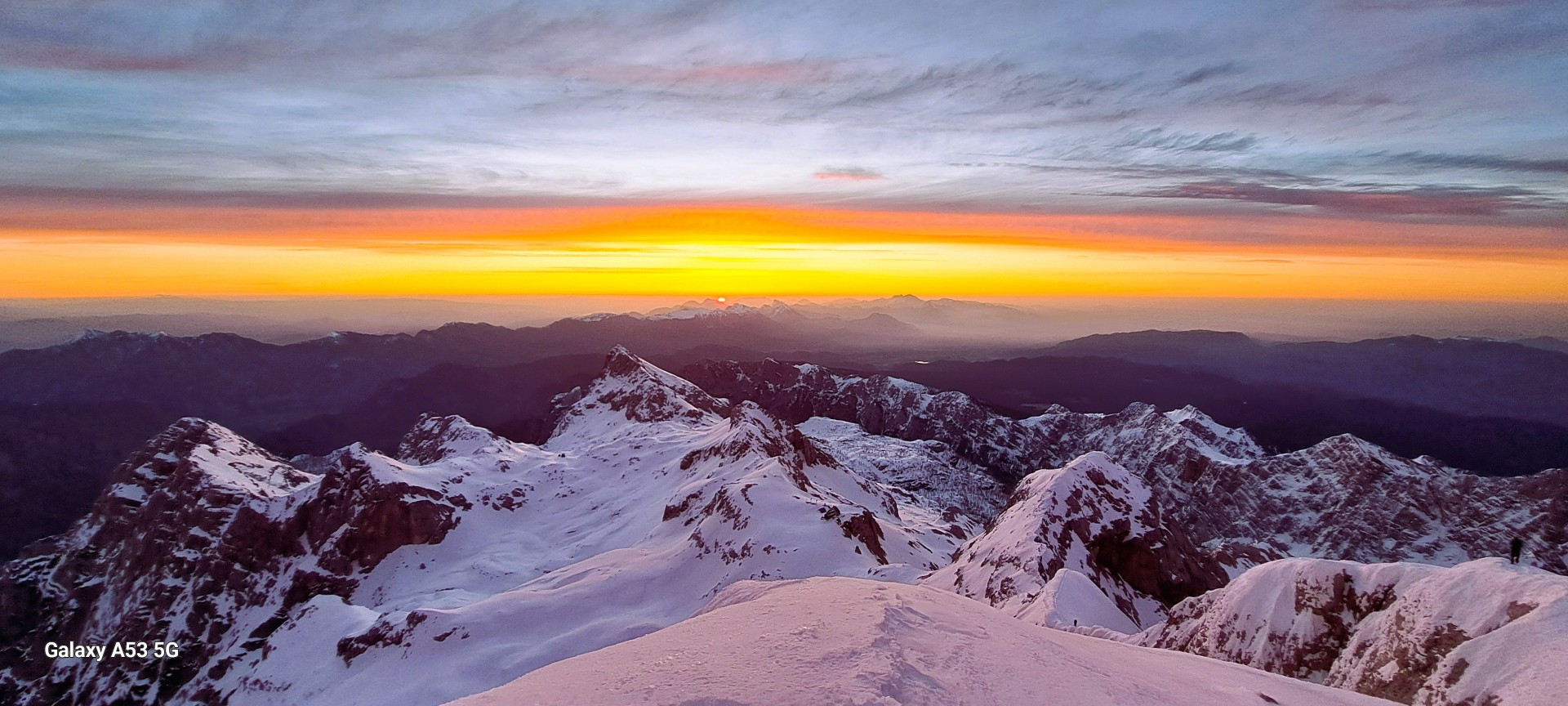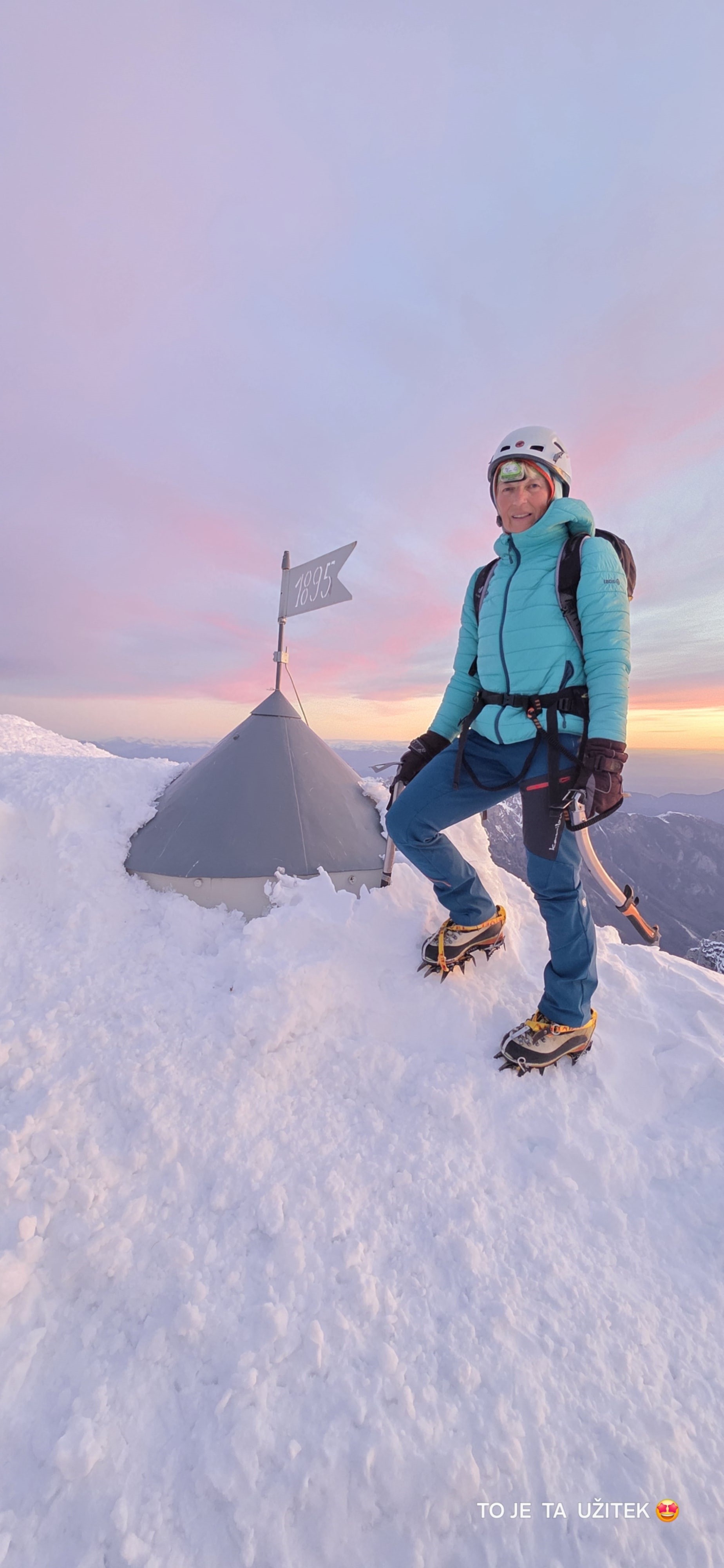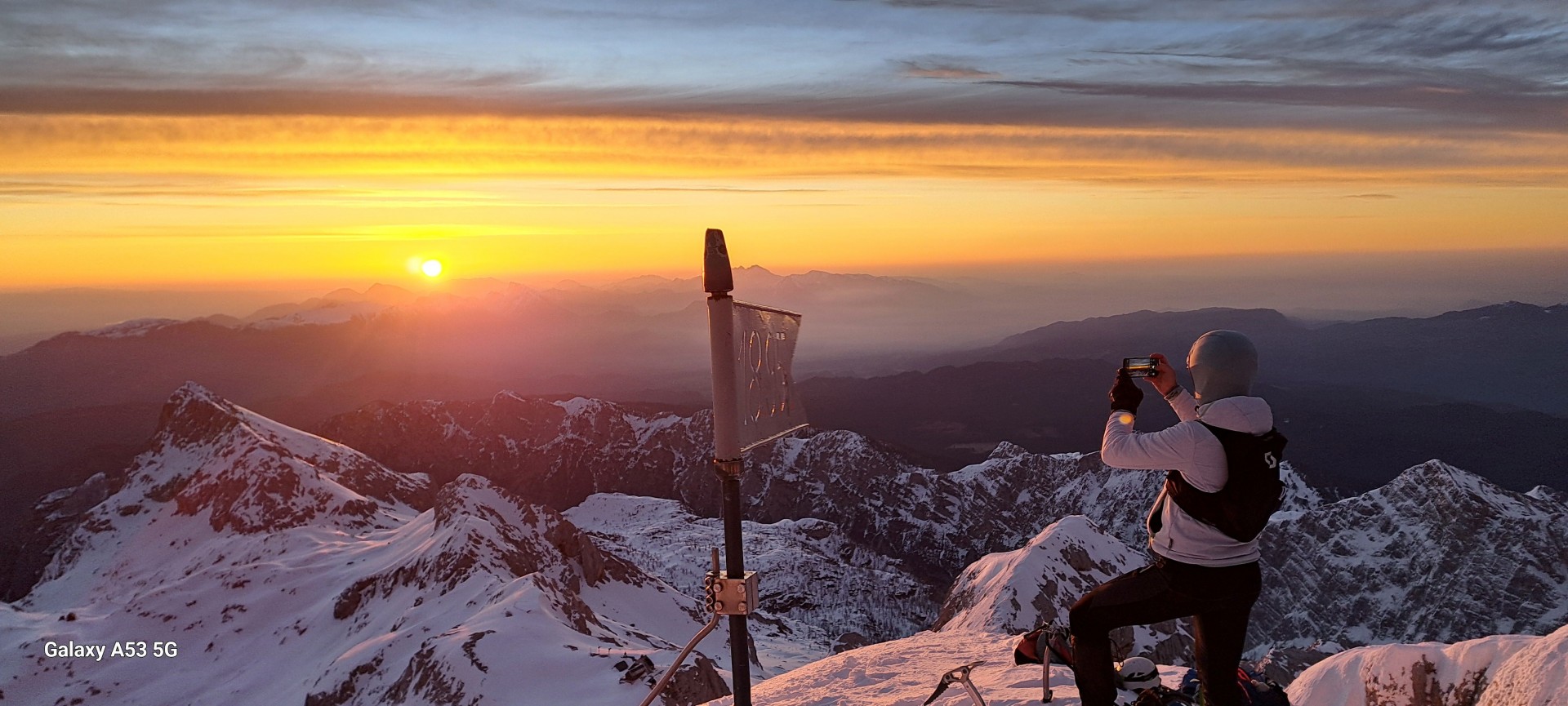 Malo čez polnoči startamo iz Krme. Polna luna nam prijetno sveti na poti in že po eni uri hoje si na noge damo dereze zaradi poledenele poti. Ni mraza, kar nas malo zaskrbi kako bo na vrhu. Že pod Prgarco sneg ponekod ne drži. Na srečo postaja bolj hladno in s tem tudi hoja bolj prijetna. Zagrizemo še v zadnjo strmino in pridemo do Triglavskega doma na Kredarici. Nekaj časa si vzamemo za topel čaj in počitek, nato se opremimo za na vrh Triglava. Stopinje so ravno prav trde, lepo se da popikat s cepini. Višje na grebenu je kakšna jeklenica tudi zunaj in prav pride za pomoč z rokami. Ko pridemo na vrh, se že dela dan in nebo počasi ožari. Gledamo v daljavo v čarobno obarvano nebo, ko se pokažejo prvi sončni žarki. Ko stojiš na vrhu najvišje gore Slovenije in gledaš zlato rdeče, oranžne barve, ki se mešajo z belino vrhov, imaš občutek, da si nekje v pravljici, vse skupaj postane prav nezemeljsko. Ne moti nas ne mraz, ne veter, ker lahko samo stojiš in gledaš, kako se nebo spreminja v nov dan. Topli sončni žarki nas spomnijo, da nas čaka še zahteven spust do Kredarice, kjer je treba biti pozoren prav na vsak korak. Napake si ne smeš privoščiti. In šele v dolini začutiš utrujenost po neprespani noči. Takrat se zaveš, da si doživel nekaj posebnega, neko čarobnost tega sveta, ki ti bo za vedno ostala v spominu.
