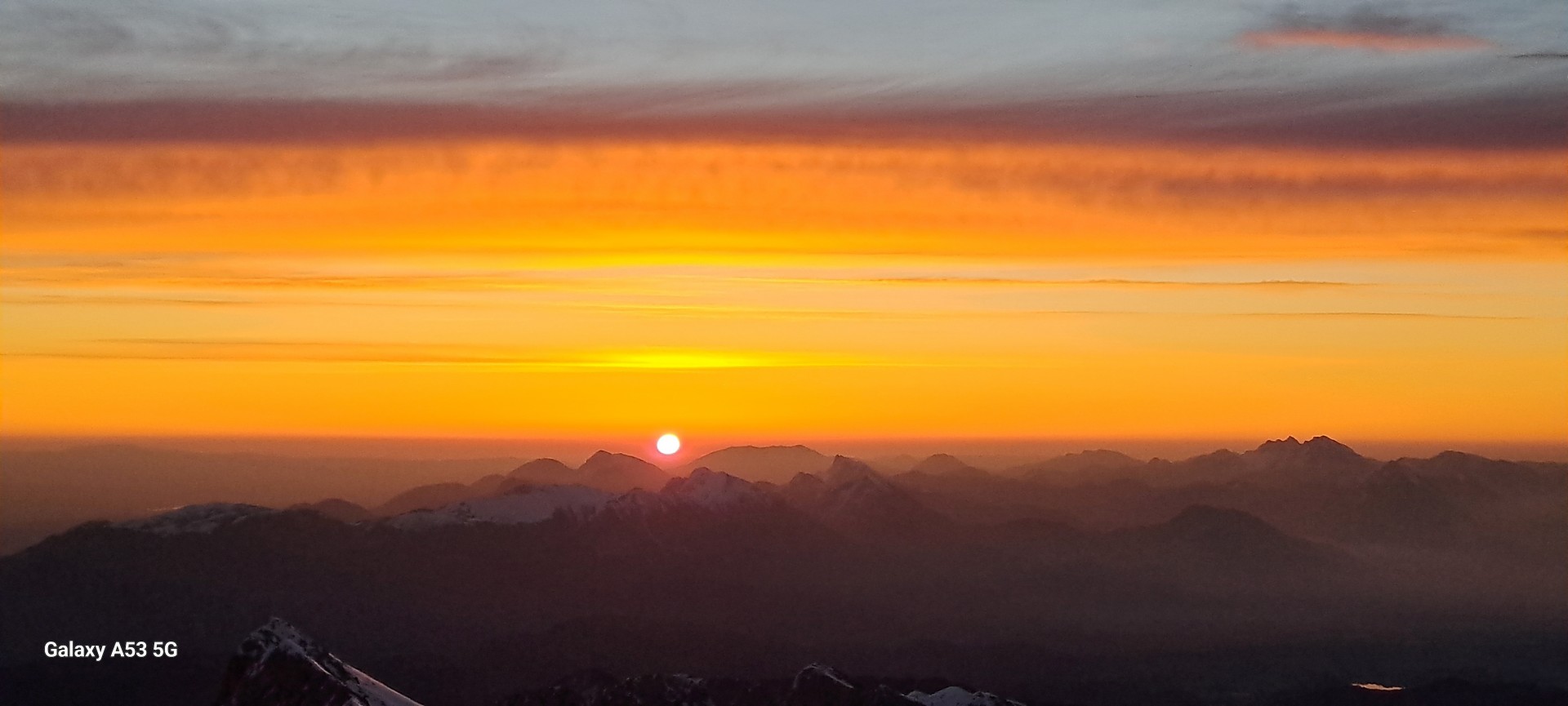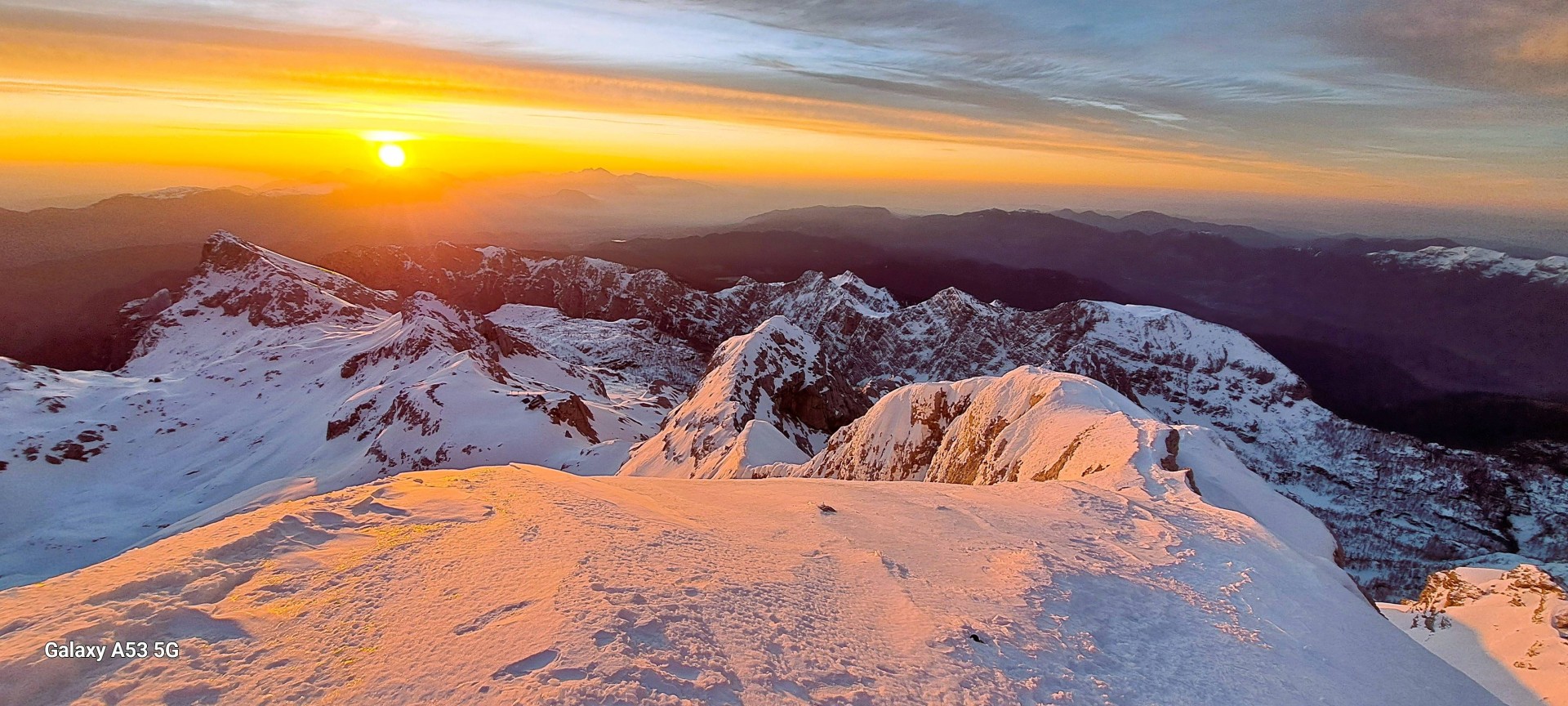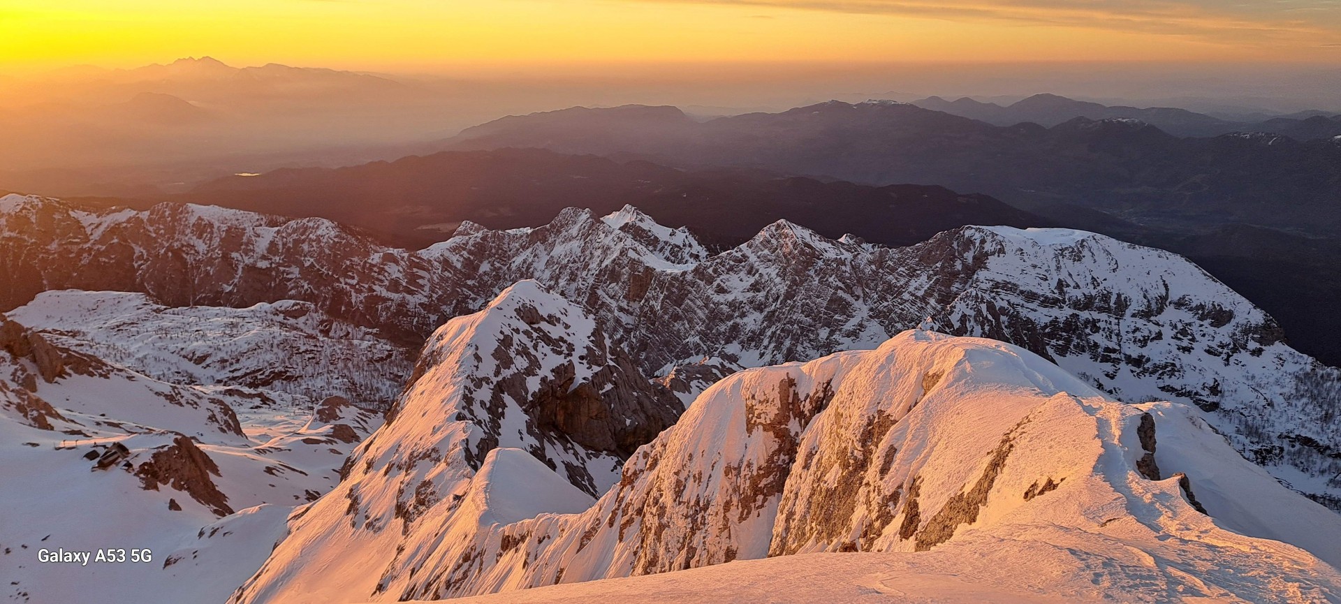 Malo čez polnoči startamo iz Krme. Polna luna nam prijetno sveti na poti in že po eni uri hoje si na noge damo dereze zaradi poledenele poti. Ni mraza, kar nas malo zaskrbi kako bo na vrhu. Že pod Prgarco sneg ponekod ne drži. Na srečo postaja bolj hladno in s tem tudi hoja bolj prijetna. Zagrizemo še v zadnjo strmino in pridemo do Triglavskega doma na Kredarici. Nekaj časa si vzamemo za topel čaj in počitek, nato se opremimo za na vrh Triglava. Stopinje so ravno prav trde, lepo se da popikat s cepini. Višje na grebenu je kakšna jeklenica tudi zunaj in prav pride za pomoč z rokami. Ko pridemo na vrh, se že dela dan in nebo počasi ožari. Gledamo v daljavo v čarobno obarvano nebo, ko se pokažejo prvi sončni žarki. Ko stojiš na vrhu najvišje gore Slovenije in gledaš zlato rdeče, oranžne barve, ki se mešajo z belino vrhov, imaš občutek, da si nekje v pravljici, vse skupaj postane prav nezemeljsko. Ne moti nas ne mraz, ne veter, ker lahko samo stojiš in gledaš, kako se nebo spreminja v nov dan. Topli sončni žarki nas spomnijo, da nas čaka še zahteven spust do Kredarice, kjer je treba biti pozoren prav na vsak korak. Napake si ne smeš privoščiti. In šele v dolini začutiš utrujenost po neprespani noči. Takrat se zaveš, da si doživel nekaj posebnega, neko čarobnost tega sveta, ki ti bo za vedno ostala v spominu.